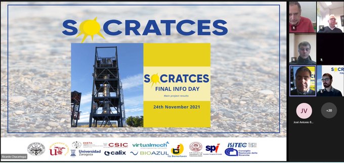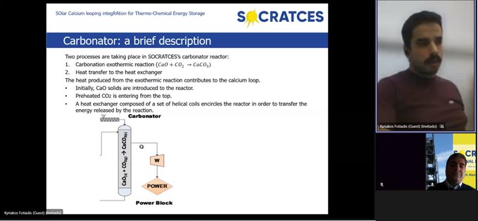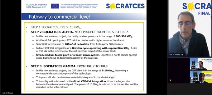 The second part of the webinar started with the presentation of Luis M. Romeo from University of Zaragoza and Thomas Hills from Calix who talked about scalling up and SOCRATCEs technologies opportunities. After this presentation was the turn of Juan Valverde and Carlos Ortiz from Virtualmech who presented the lessons learned from SOCRATCES construction and operation.