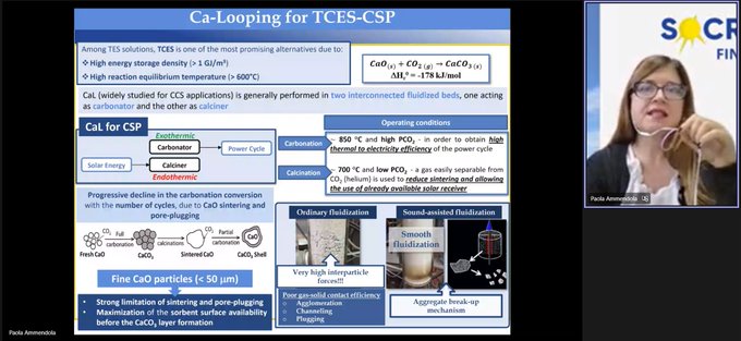 After this intervention, was the turn of Umberto Tesio from University of Torino who made a comparison of different integrations of CaL-CSP through multiobjective approach. The next speaker was Muhammad Eusha from TTZ Bremerhaven who explained the optimization of integrating a stirling engine with the SOCRATCES technology. The next aspects highlighted were carbonation on fine limestone particles for TCES-CSP as affected by acoustic perturbation which were introduced by the researcher Paola Ammendola from the Institute of Sciences and Technologies for Sustainable Energy and Mobility – CNR.