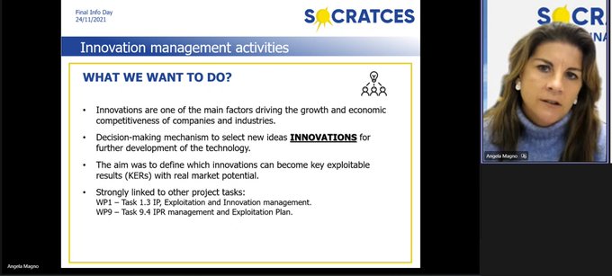 Later, Ángela Magno from Bioazul the innovation management plan developed for the project and the dissemination strategies implemented. The last presentation was the business plan and exploitation strategy for SOCRATES introduced by Denisa Mateus from SPI.