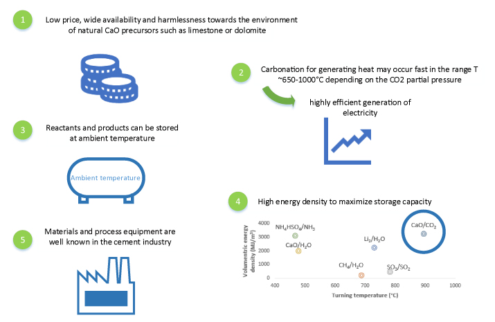 - Cheap, efficient and non-toxic. Price objective for commercial application <12€/kWh. - High CaO conversion stability, reaching residual values up to 0.5. - Seasonal storage capacity system. - Integration and uses of calcination by-products. - Validation of the concept at small prototype level. Identification and solution of challenges for scaling up the technology. |